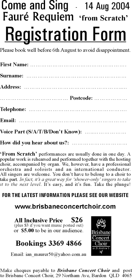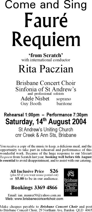 August 2004 Following the success of our Mozart Requiem from Scratch in 2003, Brisbane Concert Choir is pleased to invite singers from South East Queensland and beyond to take part in a rehearsal and performance of the beautiful Fauré Requiem. For further details please view and print our Flyer and Registration Form. ‘From Scratch’ performances are usually done in one day. A popular work is rehearsed and performed together with the hosting choir, accompanied by organ. We, however, have a professional orchestra and soloists, and an international conductor, Rita Paczian. All singers are welcome. You don’t have to belong to a choir to take part. In fact, it’s a great way for ‘shower-only' singers to take it to the next level. It’s easy, and it’s fun. Take the plunge! For an all inclusive price of $26, you receive a copy of the music to keep, afternoon tea, a delicious dinner, and the opportunity to take part in a performance of this wonderful work. For an additional fee of $3, we will post the music out to you in advance, so that you can do a little private practice on it, and perhaps allow you to get even more enjoyment from the day. Because there will be many singers present who have performed the work before, you don't have to be perfect. If you make a few mistakes, no one will know. The important thing is to have fun and help to make it an event to be remembered. There will be a limited number of seats available for supporters to be in the audience for the performance only for $5.00. Because of the popularity of this work, we anticipate that all of the available places will be taken up before bookings close. Therefore, if you wish to sing with us, it is essential to book in advance to reserve your seat. We are limited, by our venue and by our catering facilities, to a fixed number of participants. When we reach this number we will reluctantly have to decline further acceptances. How to Book Bookings can be made by printing out the Registration Form and mailing it together with a cheque for $29 (to have music posted out) OR a cheque for $26 (to collect your music on the day). Please make cheques payable to Brisbane Concert Choir, and post to Brisbane Concert Choir, 29 Northam Avenue, Bardon QLD 4065. We must receive your cheque by Friday, 6th August at the latest. (Choir groups may prefer to register and pay as a group in order to save costs on mailing out music. However, we still need a registration form filled out by each participant, with the choir name on top of the form. Please phone or email for details). There is no electronic payment facility available at this time. For further information, please check our FAQ list and our Details Page. If your question has still not been answered, contact Ian Maurer by email or telephone (07) 3369 4866. If you already have a copy of the music, you may choose to save a tree and sing from that copy. If so please indicate on your Registration Form that you do not require music. Unfortunately, there is no reduction in price, but you do get to enjoy that warm and fuzzy feeling for doing the right thing by our planet. The edition which we are using is published by the Choral Public Domain Library at www.cpdl.org , and has been printed and bound for ease of use. You might like to verify that your edition matches the one we will be using in order to avoid frustration. Further detail will be added to this page as we get closer to the event, so bookmark our site and check it regularly. If you supply your email address on your Registration Form, you will be notified promptly of any changes. SEE YOU THERE ON SATURDAY, 14th AUGUST 2004 !!! (Dates, times and programmes subject to change) |