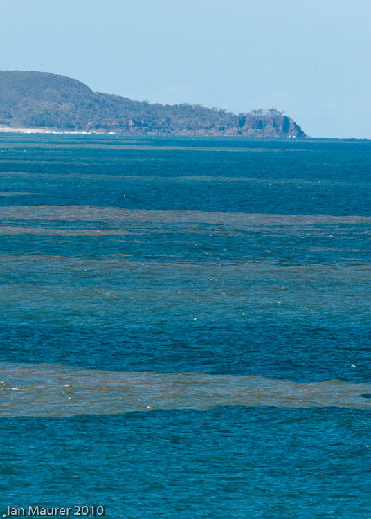 The headlands at Coolum Beach provide stunning views of the water, shipping, swimmers and surfers. Coloured bands in the water are most likely the result of a coral spawning event.
