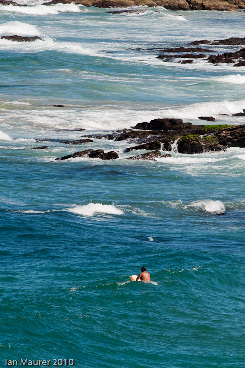 The headlands at Coolum Beach provide stunning views of the water, shipping, swimmers and surfers. Coloured bands in the water are most likely the result of a coral spawning event.